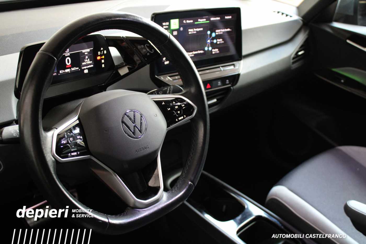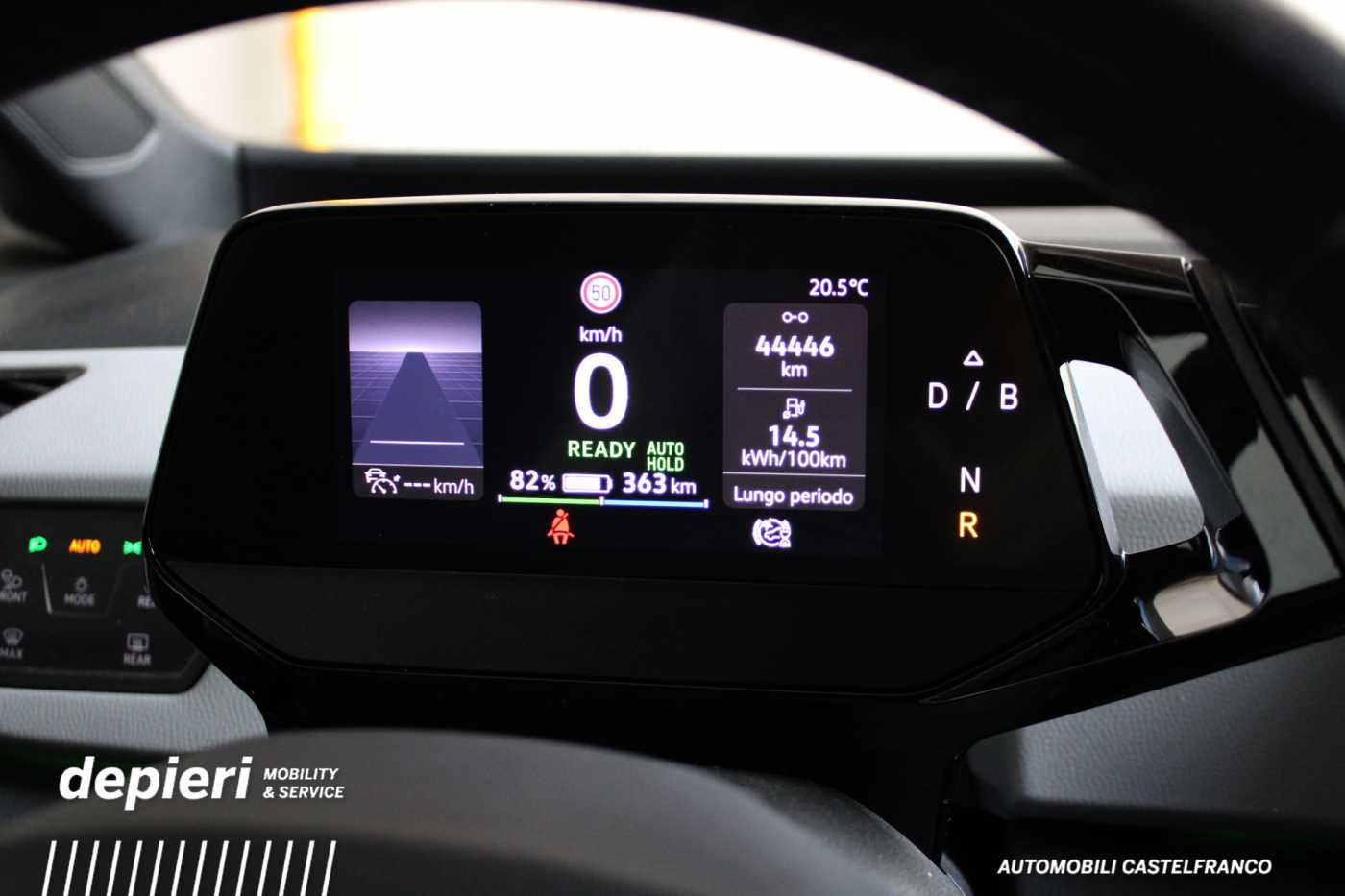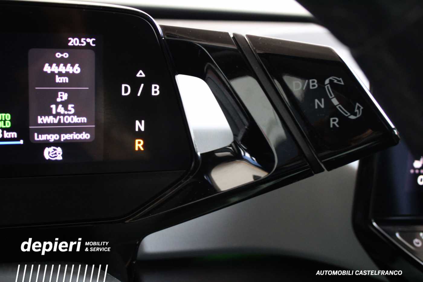 Equ: E113MJ+W6R, EA8 +3ANNI / 100.000KM, BUSINESS (Adaptive Cruise Control - ACC, Lane Assist, Light Assist, Riconoscimento segnaletica, Sensore pioggia, Sensori di parcheggio anteriori e post, Climatronic, CAVI RICARICA, Controlli touch o a sfioramento, Driving Profile Selection, Keyless Go, Specchietti retrovisori elettrici e riscaldati, Ambient Light, Fari LED, ID.Light, Tetto nero, App-Connect, Car2X, Infotainment con schermo touch da 10", Natural Voice Control, DAB, Digital Cockpit Pro, Navigatore "Discover Pro", Ricarica wireless per smartphone, Predisposizione telefono, Consolle centrale "high", Specchietti retrovisori esterni ripiegabili elettric, Sedili anteriori riscald, Volante riscaldabile in pelle, INTERNI STYLE, Sedili in due tonalità di grigio, Bracciolo nella fila post, Pedali "Play&Pause", Volante in pelle riscaldabile , DESIGN PACK Ambient light (30 colori), Fari LED Matrix anteriori, Fascia luminosa illuminata, Fari LED post, frecce dinamiche, Privacy Glass, ASSISTANCE PACK Sistema allarme antifurto, Sistema Pre-Collisione, Retrocamera Rear view, Keyless Open, Maniglie delle portiere illuminate ), PJB Cerchi in lega East Derry 7 J x 18 con superficie diamantata), Batteria kWh 58, Caricatore AC fino a 11kW - Potenza omologata 70kw / potenza complessiva 150kw/204CV
