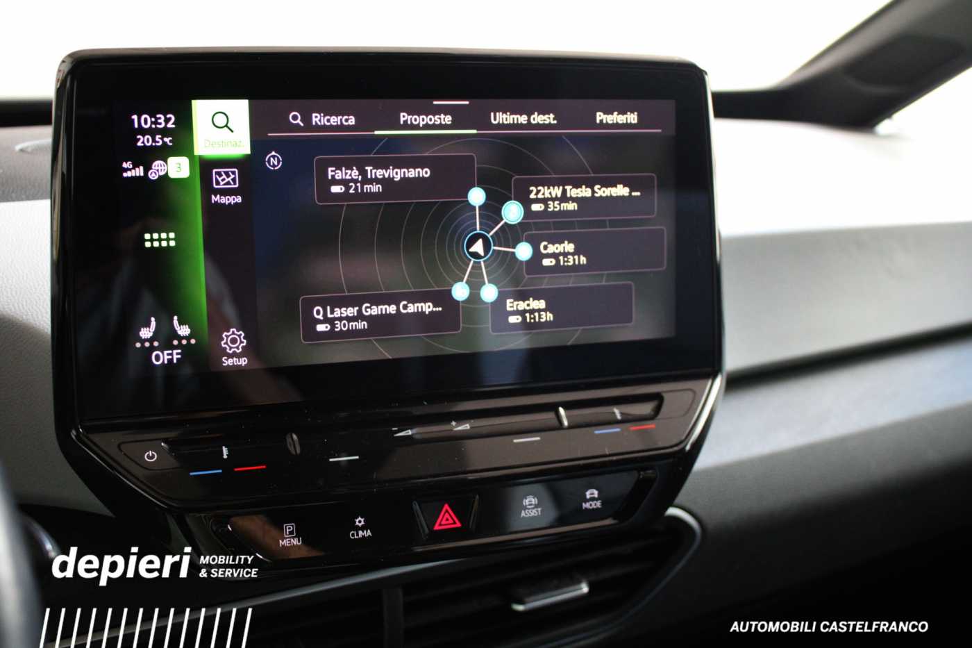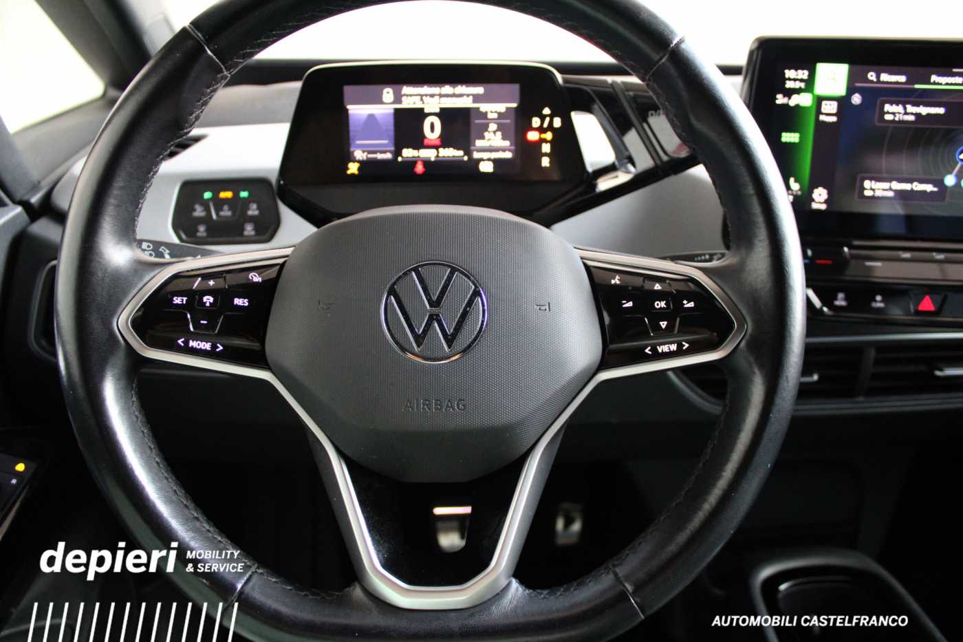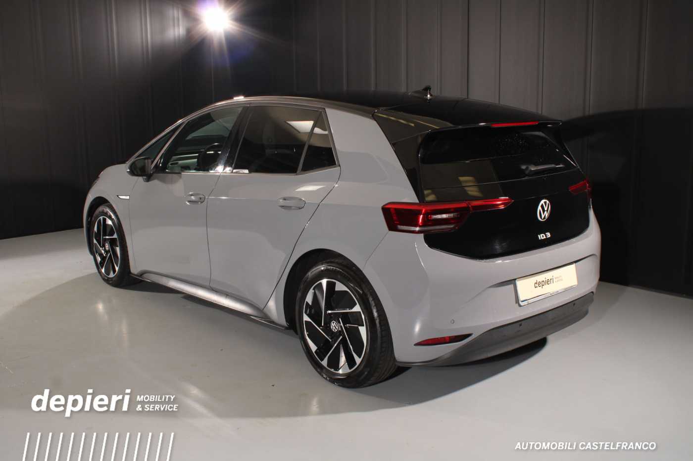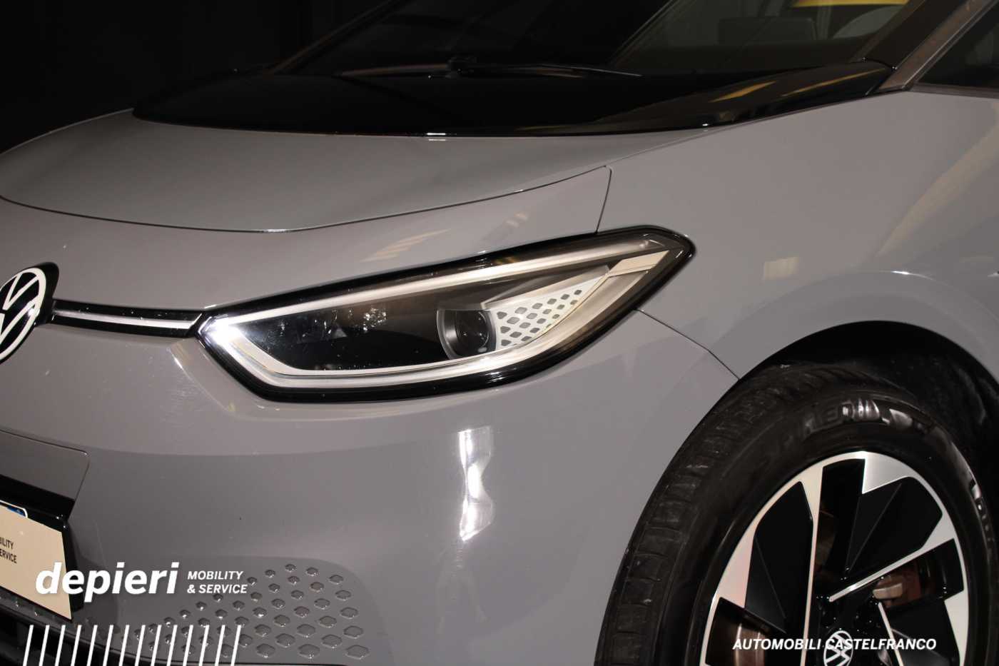 Equ: E113MJ+W6R, EA8 +3ANNI / 100.000KM, BUSINESS (Adaptive Cruise Control - ACC, Lane Assist, Light Assist, Riconoscimento segnaletica, Sensore pioggia, Sensori di parcheggio anteriori e post, Climatronic, CAVI RICARICA, Controlli touch o a sfioramento, Driving Profile Selection, Keyless Go, Specchietti retrovisori elettrici e riscaldati, Ambient Light, Fari LED, ID.Light, Tetto nero, App-Connect, Car2X, Infotainment con schermo touch da 10", Natural Voice Control, DAB, Digital Cockpit Pro, Navigatore "Discover Pro", Ricarica wireless per smartphone, Predisposizione telefono, Consolle centrale "high", Specchietti retrovisori esterni ripiegabili elettric, Sedili anteriori riscald, Volante riscaldabile in pelle, INTERNI STYLE, Sedili in due tonalità di grigio, Bracciolo nella fila post, Pedali "Play&Pause", Volante in pelle riscaldabile , DESIGN PACK Ambient light (30 colori), Fari LED Matrix anteriori, Fascia luminosa illuminata, Fari LED post, frecce dinamiche, Privacy Glass, ASSISTANCE PACK Sistema allarme antifurto, Sistema Pre-Collisione, Retrocamera Rear view, Keyless Open, Maniglie delle portiere illuminate ), PJB Cerchi in lega East Derry 7 J x 18 con superficie diamantata), Batteria kWh 58, Caricatore AC fino a 11kW - Potenza omologata 70kw / potenza complessiva 150kw/204CV